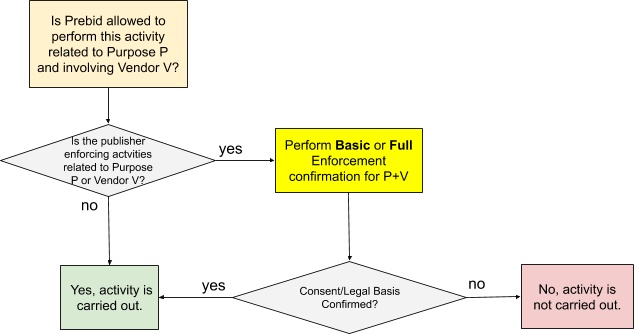Prebid offers publishers several controls for whether consent/legal basis confirmation is even performed. The following flowchart shows how the controls